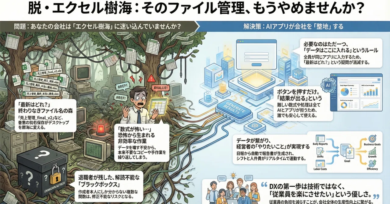DXの第一歩は、技術導入ではありません。 社長が事務員さんに優しく声をかけること。 **「頑張らなくていい、もう楽になろう」**という社長の優しい一言から、エクセル地獄からの脱出は始まります。