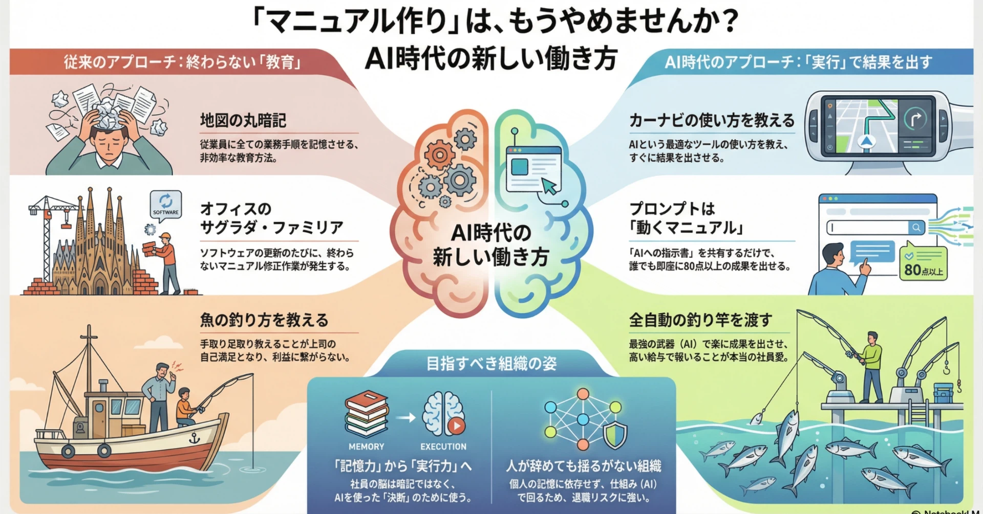 従来のマニュアル教育は、例えるなら新入社員に**「詳細な地図を渡して、目的地までのルートを丸暗記させる」**ようなものでした。