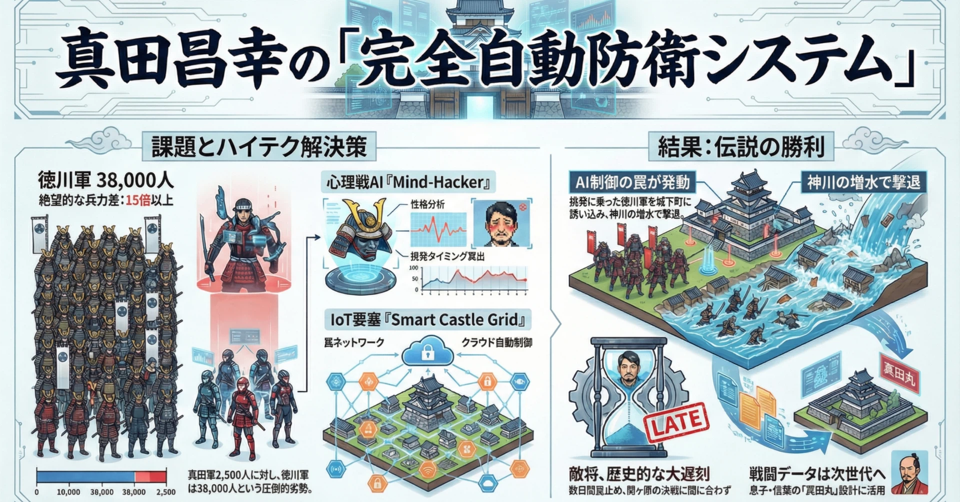 今回のケーススタディ(File No.03)は、戦国屈指の知将・真田昌幸(さなだまさゆき)。 あの「真田幸村(信繁)」の父であり、徳川家康が最も恐れた男です。 彼が成し遂げた奇跡の防衛戦「第二次上田合戦」。その裏には、実は最新鋭の**「IoT要塞システム」「心理戦AI」**が稼働していたとしたら?