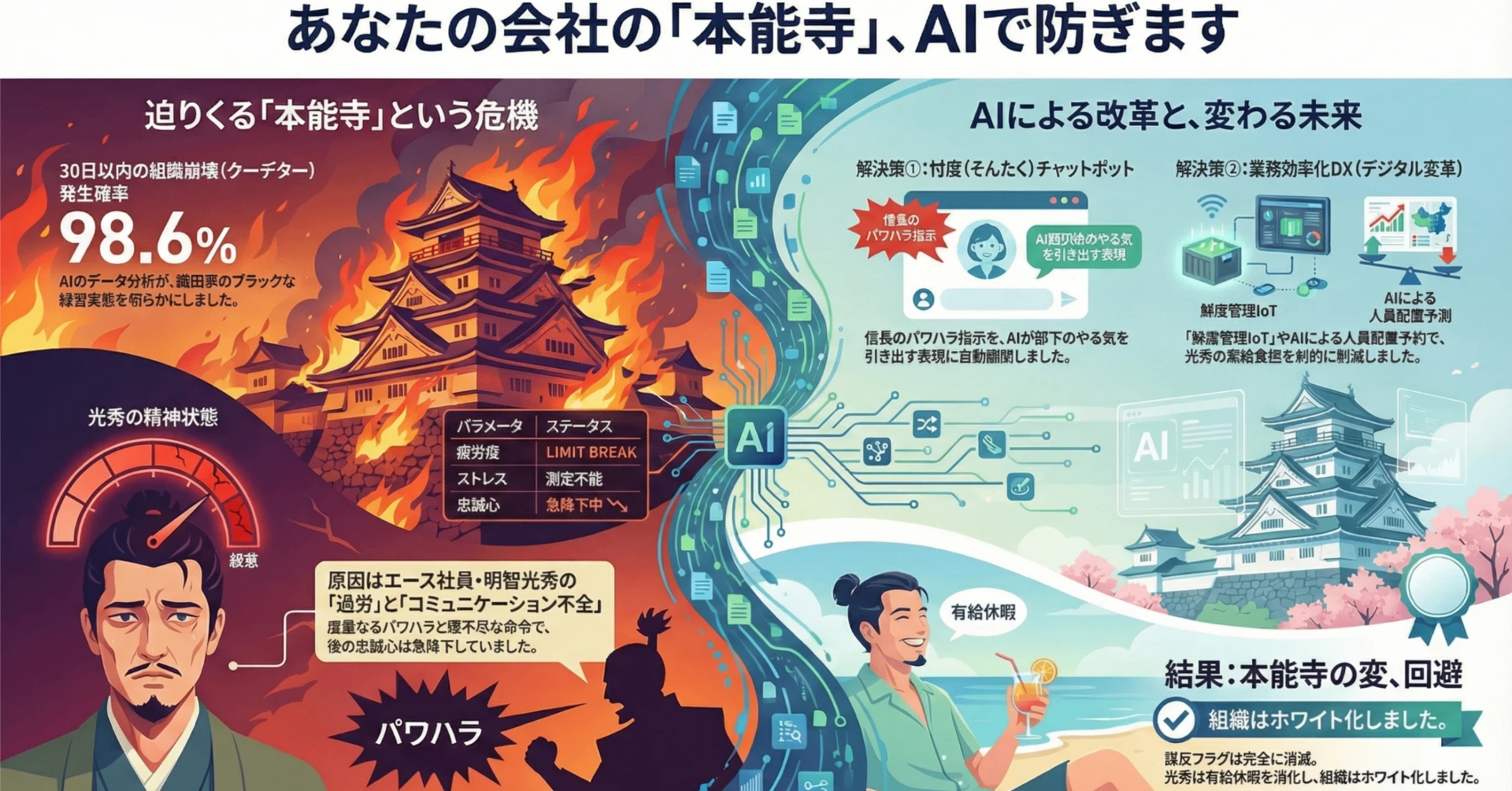 信長社長は驚愕します。 「光秀は優秀な部下だ。俺の厳しい指導にも耐えているはずだ」 しかし、データは嘘をつきません。彼は耐えているのではなく、爆発寸前だったのです。