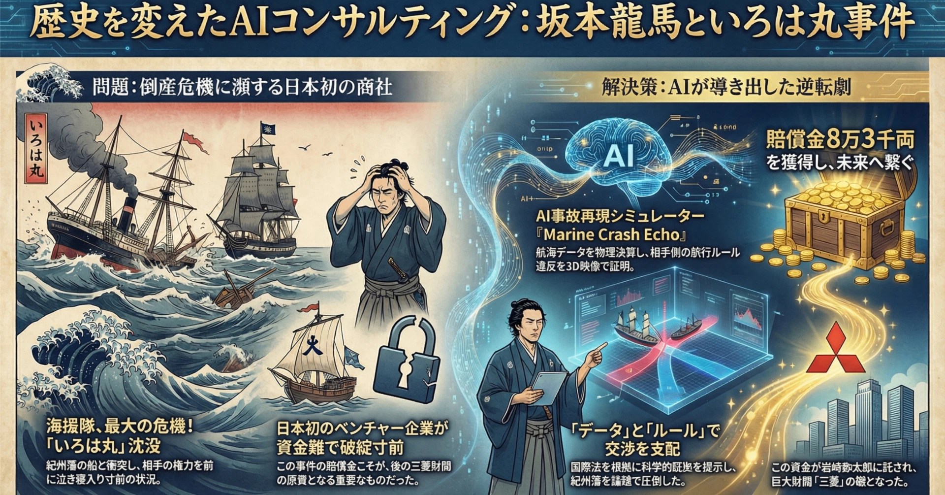 龍馬はその後、凶刃に倒れますが、彼が残した「商社」というビジネスモデルと、この時勝ち取った莫大な資金は、岩崎弥太郎に引き継がれました。 弥太郎はこの資金を元手に海運業を拡大。それが後の「日本郵船」、そして巨大な**「三菱財閥」**へと成長していくのです。 あの時、AIと龍馬が諦めていなければ、今の三菱グループも、日本の近代産業の発展もなかったかもしれません。