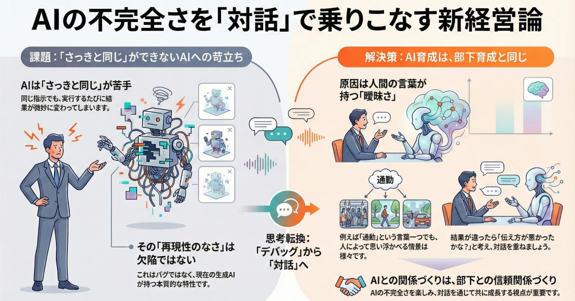 そんな風に、対話を重ね、修正し合い、お互いの認識のズレを埋めていく作業。 それはまさに、部下の育成や、人間同士の信頼関係構築そのものです。