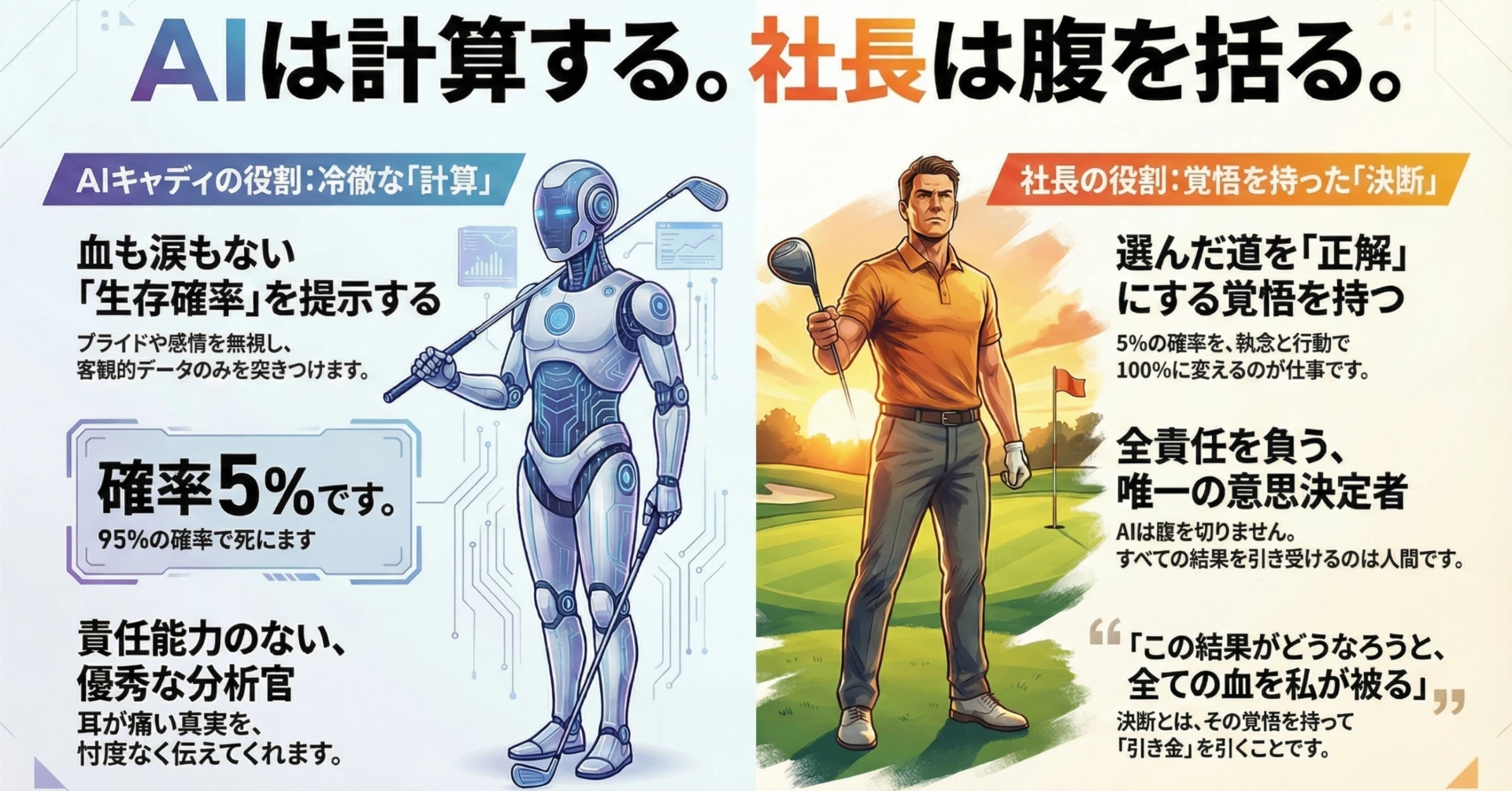 AIに感情はありません。あなたのプライドなど1ミリも配慮しません。 「社長、データ上、この風速で池を越える確率は5%です。95%の確率で死にます。8番で刻んでください」