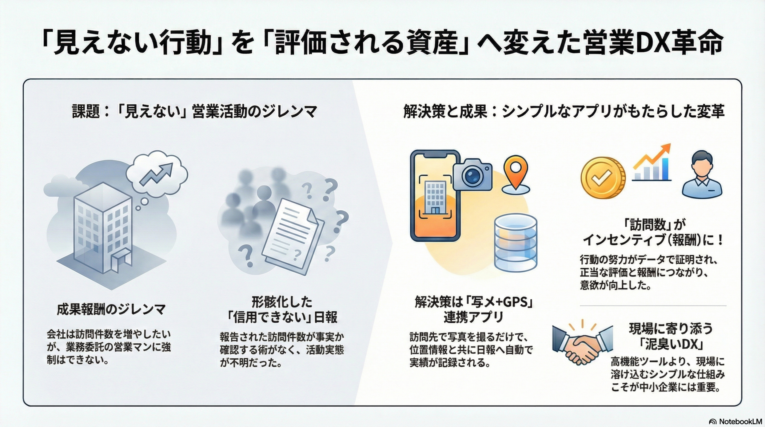 そして何より大きな変化は、**「訪問件数もインセンティブ(報酬)として評価されるようになった」**ことです。 「契約が取れなければゼロ」ではなく、「確実に足を使って回った努力」が、アプリのデータによって証明され、それに対して対価が支払われるようになったのです。 これにより、営業マンのモチベーションは劇的に向上しました。