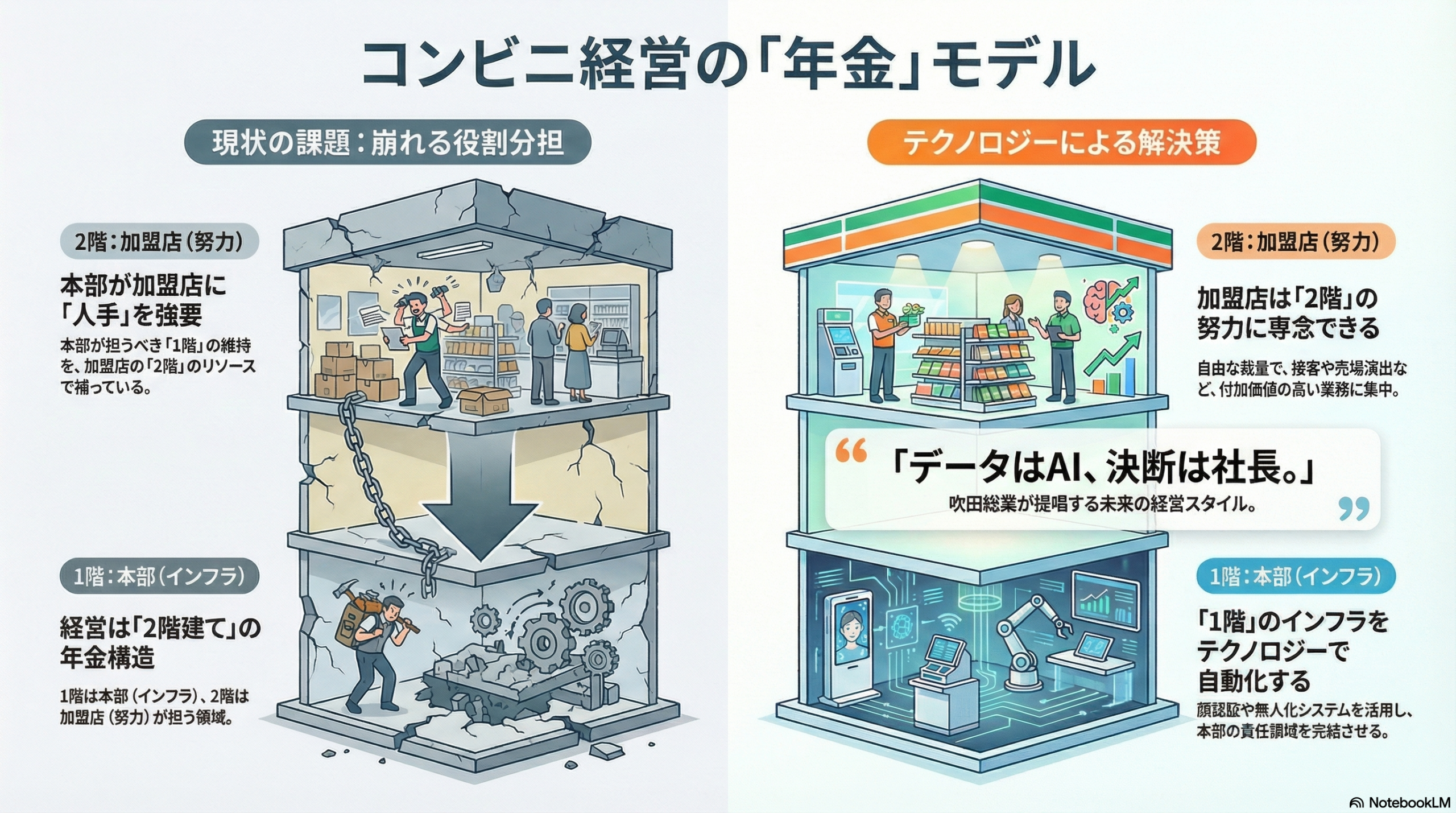 前回はシステムの弱体化について話しました。今回は解決策です。 コンビニ経営は「2階建て」であるべきです。