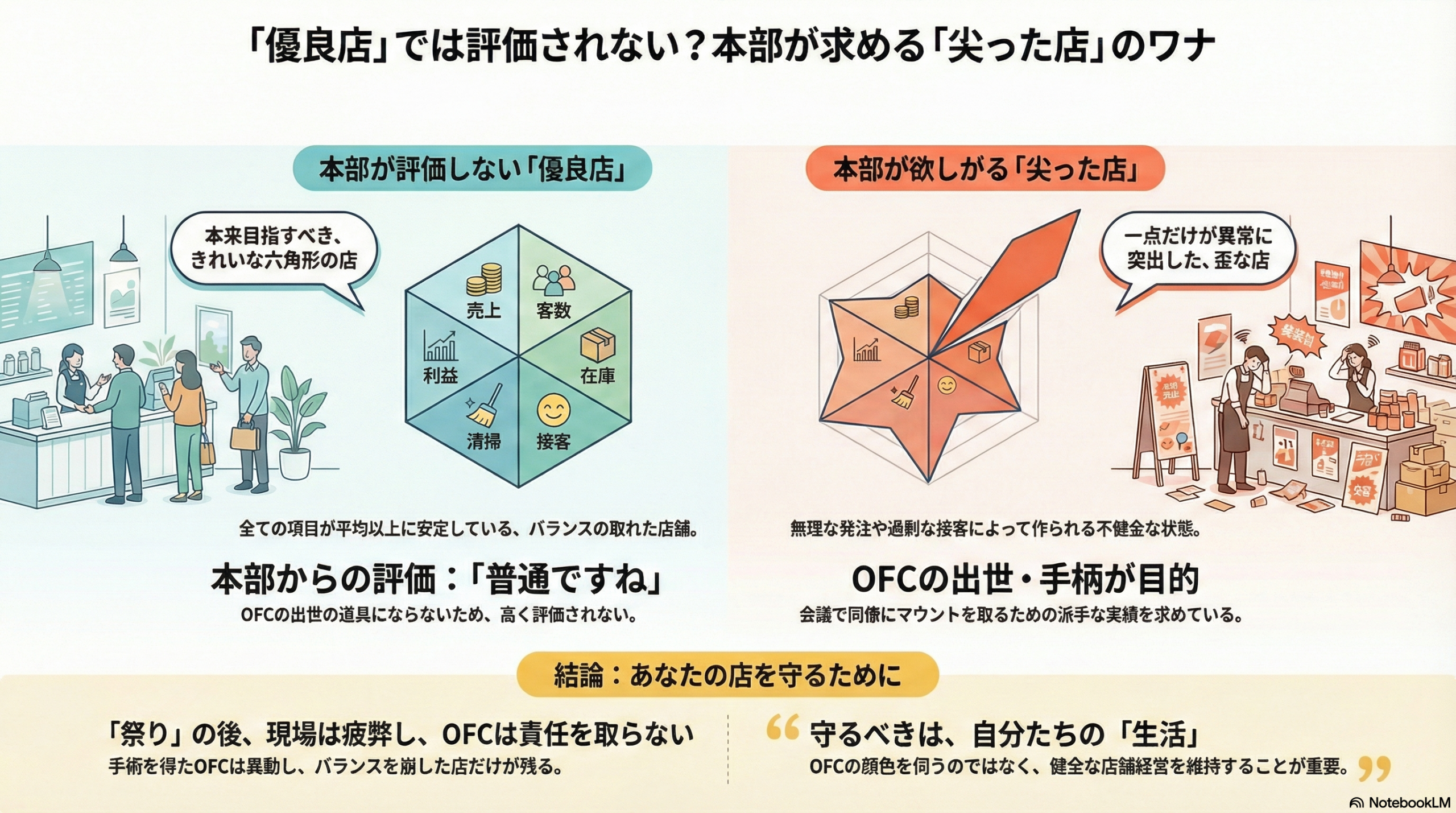その瞬間、店は輝くかもしれません。OFCも鼻高々でしょう。 しかし、その無理な負荷は、確実に現場を蝕みます。