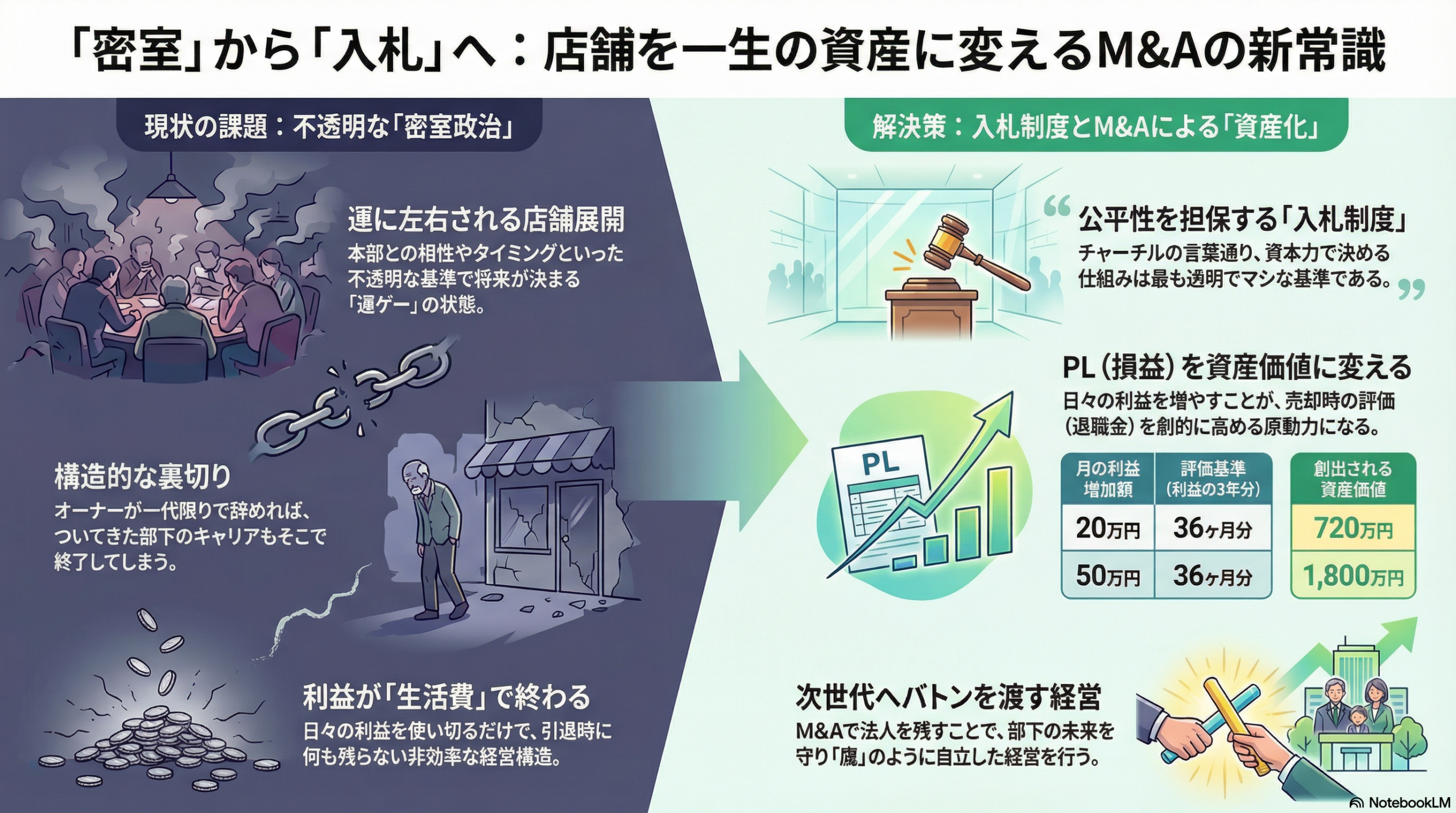 そして、この仕組みが導入されれば、私たちの働き方は劇的に変わる。 PL(損益計算書)の最終利益は、「今月の生活費」ではなく、**「店の売却価格(資産価値)」**に変わるからだ。