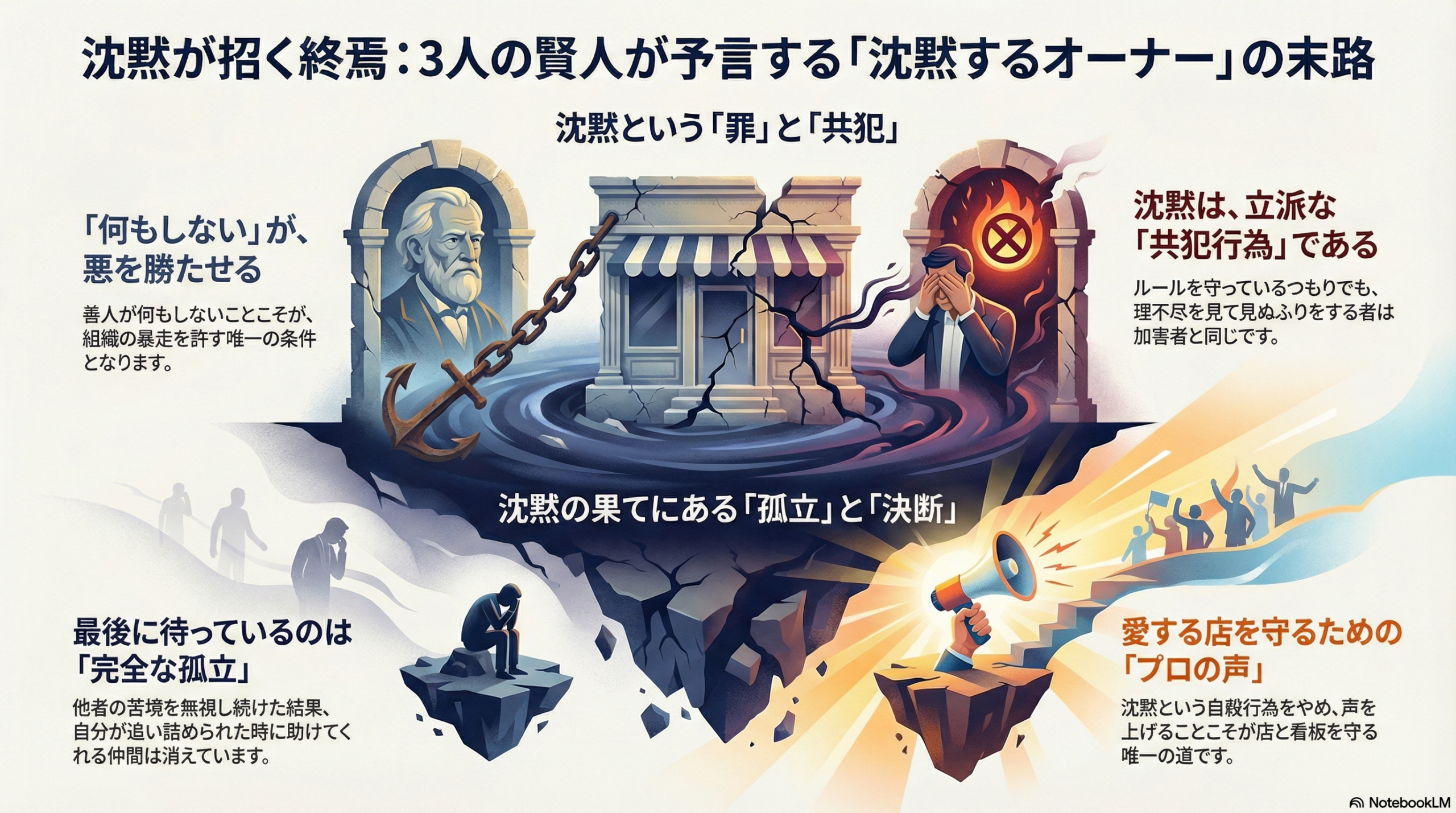 彼は、「悪人(理不尽な本部)」よりも、「沈黙する善人(従順なオーナー)」の方が罪深いと断じたのだ。 なぜか? 悪人は自覚して悪を行うが、沈黙する善人は「自分は潔白だ」と信じ込んだまま、悪に加担するからだ。 隣の店が潰れそうな時、あなたが「関係ない」と目を逸らしたその瞬間、あなたは本部の理不尽な施策に対する**「承認者(イエスマン)」**になったのだ。